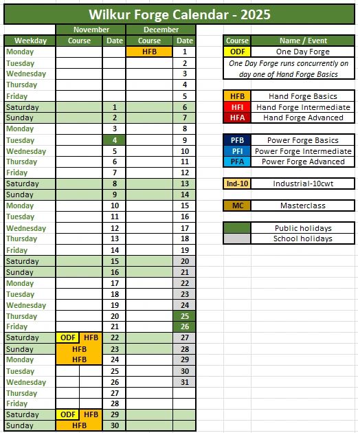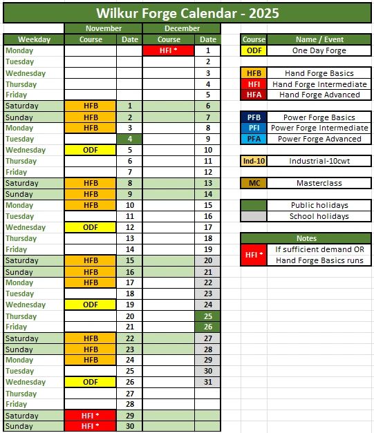 As the weather is often too hot to forge in during the Summer months, Wilkur Forge's courses go into recess from when the weather starts to get hot until the conditions cool down somewhat.